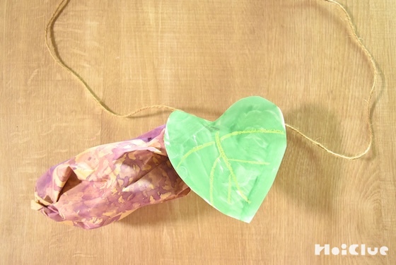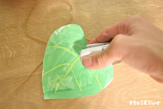 3. 絵の具が乾いたら、葉っぱを麻紐にホチキスでとめる。