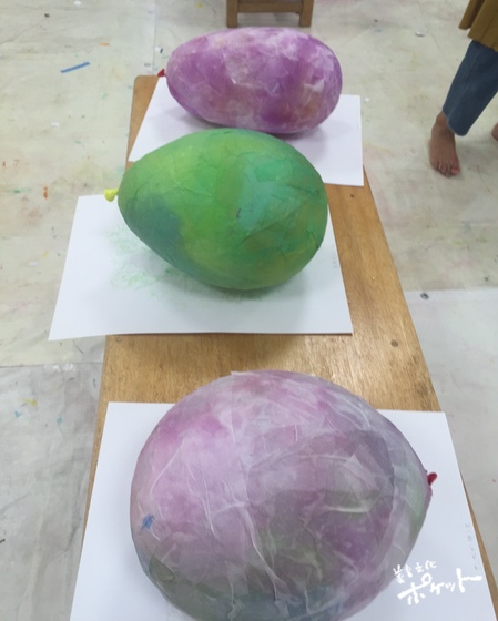 ※「張り子*」の技法を使い、中が空洞の丸い立体を作ります。
