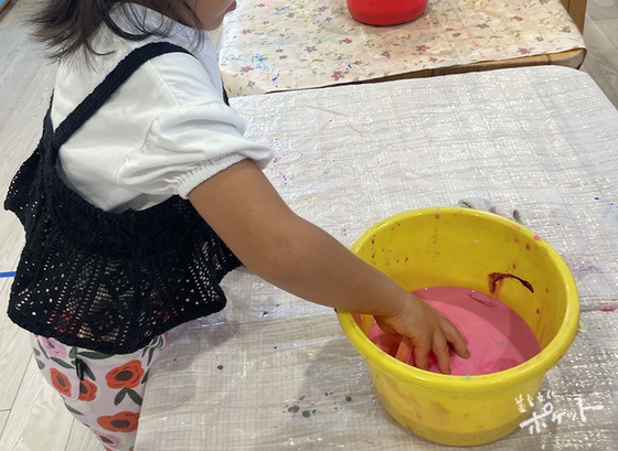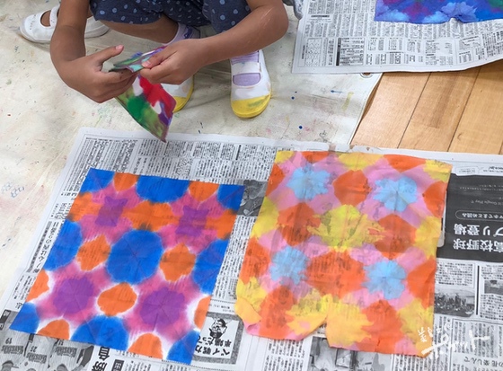 約25cm四方に切った障子紙を用意します。さまざまな折り方で最終的に三角形(アレンジした多角形でも可)にし、その角を水で溶いた絵の具に1秒から数秒浸します。その後、開いてみると模様ができているという技法遊びです。折る形や使う色、浸す秒数などで無限のパターンが楽しめます。