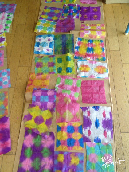 1、まずは障子紙を折って、水で薄く溶いた絵の具に浸す「染め紙」を作ります。(詳しくはこちら)