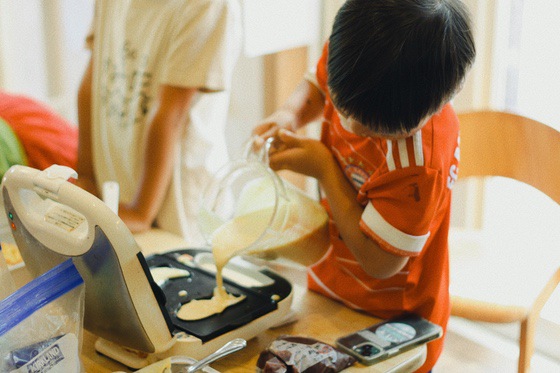 あんこも用意し、生地に包み込んで鉄板へ。部屋いっぱいに甘い香りが広がり、「いい匂いしてきた!」と声が弾みます。