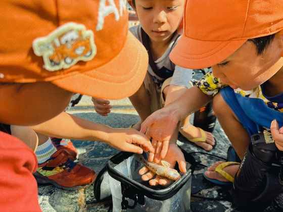 1時間半の釣りで釣れたのは、ハゼ、ガザミ、クロダイ、メゴチ。水面から上がってくる生き物たちに「つれた!」「おもい〜!!!!」「え、カニだ!!!!!」と目を見開く子どもたち。自然と出会う、その一瞬一瞬がかけがえのない体験になっていきました。