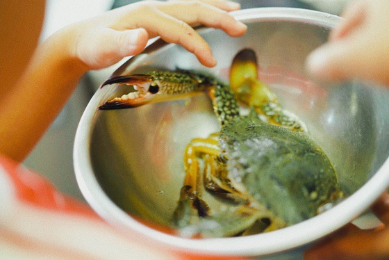 終わった後は園舎に戻って、釣った魚を捌いてガザミを茹でると、みるみるうちに殻の色が変わっていきます。