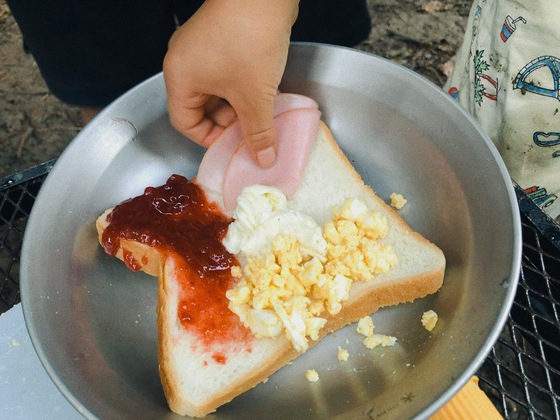 翌朝、朝ごはんは手作りいちごジャム、手作りマヨのスクランブルエッグ、ハム、チーズ、たい焼きの余ったカスタードを好きにトッピング。