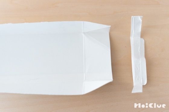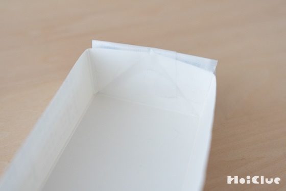 4. 注ぎ口を折り線に沿って畳み、テープでとめて、箱状にします。