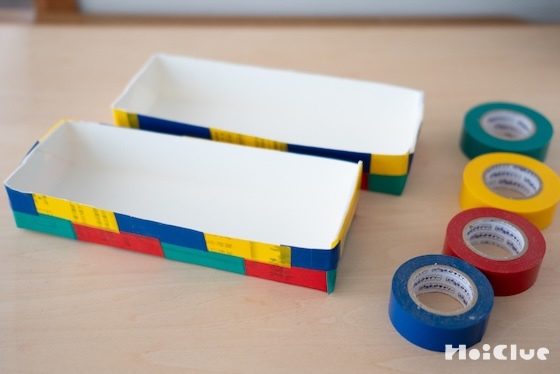 5. 箱ができたら、ビニールテープをハサミでカットしてペタペタと貼り、カラフルな宝箱に仕上げましょう。