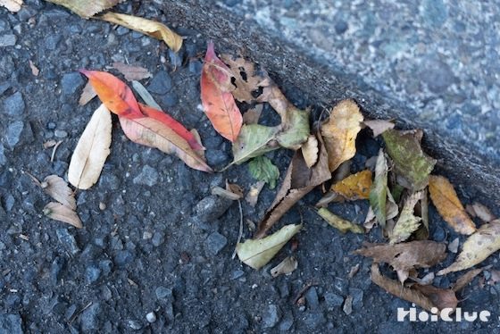 宝箱が出来上がったら、中に入れる宝物を探しに、ビニール袋や紙袋を持って、お散歩に出かけましょう。最初に、道の端っこに、赤い落ち葉を発見!素敵な宝物を見つけたら、袋に入れましょう。