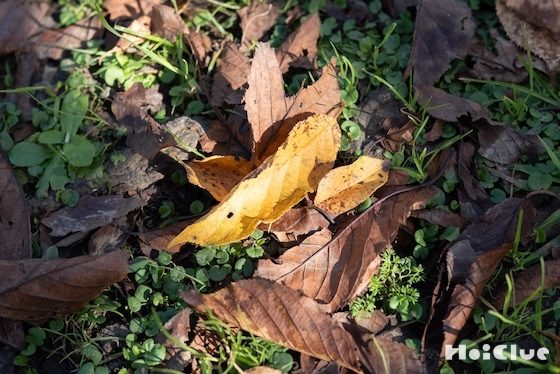桜の落ち葉の中に、黄色い落ち葉を発見!これも宝物にしましょう。
