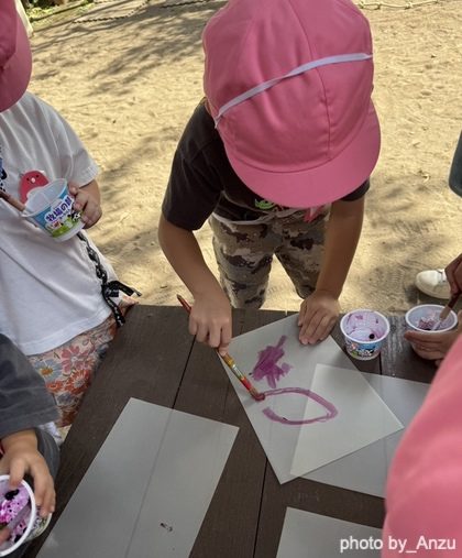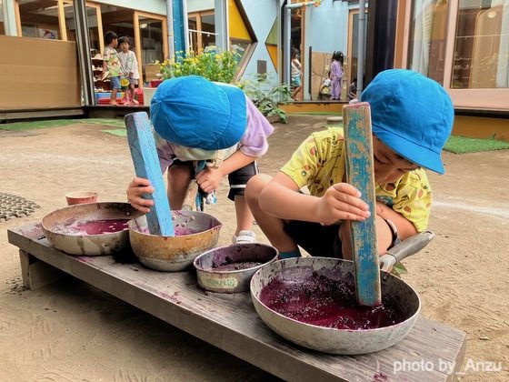 子どもたちは色水遊びや、実をつぶして色やつぶした時の感触を楽しみながらままごとや絵を描いて遊んでいます。