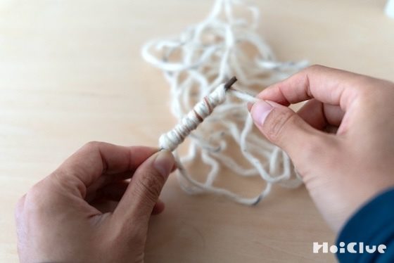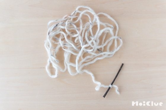 3. 毛糸を木の枝に、ぐるぐると巻き付けます。最初は結び目を押さえておくと、巻きやすいです。両端の先端は毛糸を巻かず、残しておきましょう。