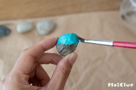 4. まず筆に少しだけ水を含ませて、好きな色を小石に塗っていきます。