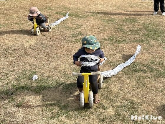 園庭に持っていくと、長さをそのまま楽しむ子や、長さを活かして遊ぶ子も。