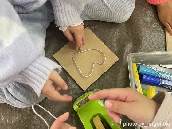 針金をさまざまな形にしダンボールに貼り付けて、色付け。ハートや丸など思い描いた形に変える人もいれば、思いつきの形を貼り付けていく人、『かき氷みたい!』と夏を思い出してクルクル回す人。(貼ってくれ〜)