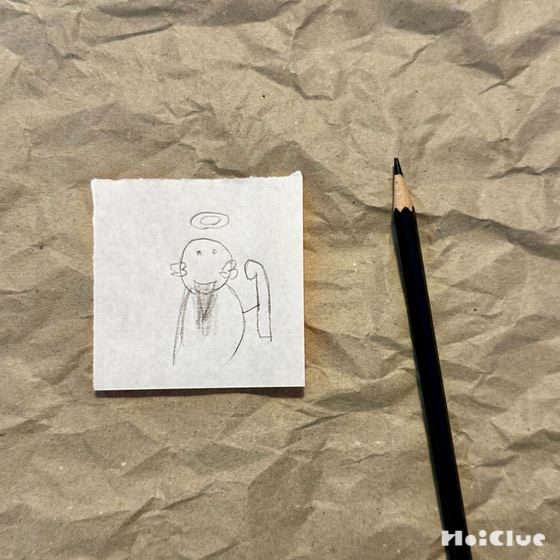 1、折り紙に、神さまを描いて、絵が内側になるように折りたたみます。