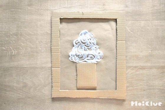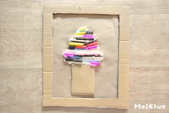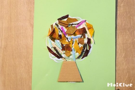 ダンボールを小さく切って貼り、木の幹を作る。その上に木工用接着剤で木の形(枝のライン)を描き、接着剤が乾かないうちに、好きな棒を並べて貼っていく。