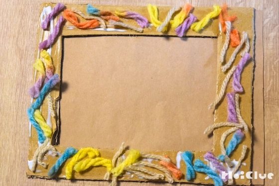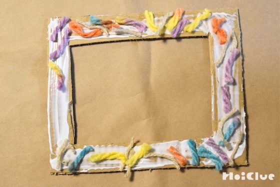 額縁全体に木工用接着剤を塗り、短く切った毛糸を貼りつけていく。