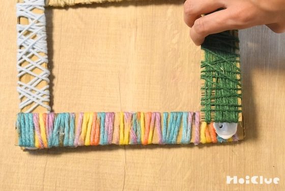 棒状のダンボールにぐるぐる毛糸を巻き、テープでとめる。
