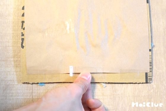 額縁と木が乾いたら、両方を裏返しにして、テープで貼り合わせる。