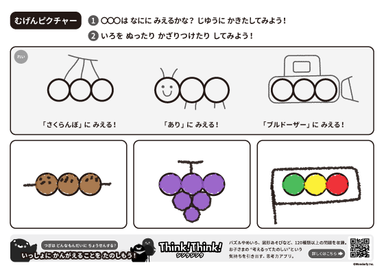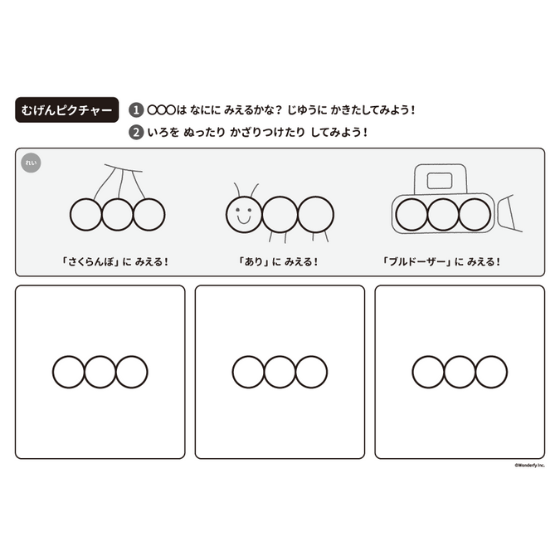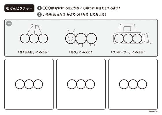 このぬりえ教材「むげんピクチャー」は、思考力が育つアプリ『Think!Think!(シンクシンク)』を開発したワンダーファイが、「考えることを楽しむ体験」を紙のあそびとして形にした「シンクシンクペーパー」シリーズの一つです。