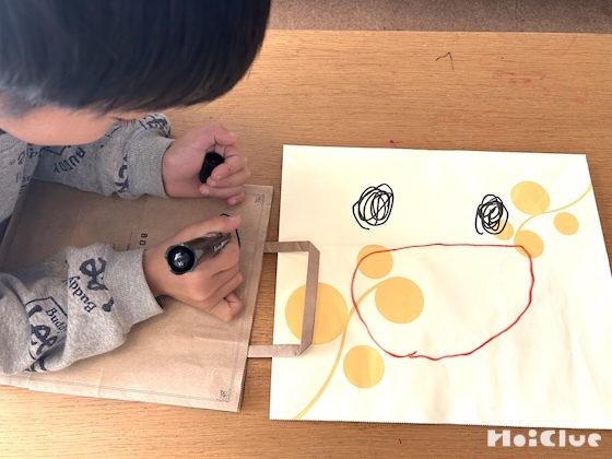 1. 紙袋に鬼の目と口を描いて、口の部分を切り抜く。