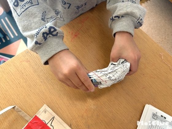 新聞紙をねじって、思い思いの鬼のツノを作ろう!