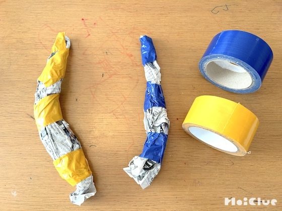 2. 新聞紙をねじって曲げて、色々なツノの形を作り、カラーガムテープで巻く。