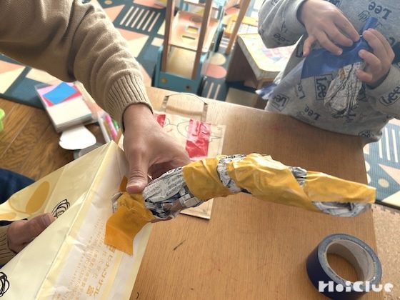 ツノができたらガムテープで紙袋の好きな場所に貼る。