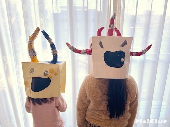 毛糸や色紙を貼ったり、目の部分に穴を空けたり、紙袋に絵の具で色を塗ったりすると、より鬼らしいお面にもなりますが、まずはシンプルに。