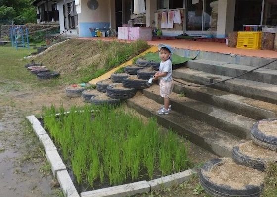 仮設住宅生活が長くなると、他のクラスの子も興味を持つようになり、一歳児Fが昨年収穫して展示しておいたお米を水槽に入れてしまった。保育者も予想外の出来事であったが、なんと、水槽の中でお米から芽が出てきた。何日か経つと、仮設住宅の中も田んぼのようなり、それを見た子どもたちは「じゃあ、この水槽ごと田んぼに入れたらいいじゃん!」「やってみよう!」と田んぼに穴を掘り、水槽ごと田んぼに入れた。水がなくなってしまうことは解決できなかったが、子どもたちの納得のいく形でおたまじゃくしの引っ越しが完了した。田んぼの家に住ませてあげたいと思う気持ちと、生き続けて欲しいという願いが叶った瞬間だった。