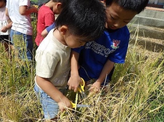 九月下旬、緑だった粒々が茶色へと変化し、稲穂が垂れ下がってきた。そろそろかな?と待ち遠しい子どもたちと私は、少しだけハサミで切って中身を覗いてみた。「お米、できてる!」「切って取ろう!」と次々にハサミを持ち寄り、切って収穫をした。