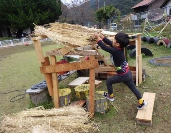 収穫をしたら次は脱穀である。これも子どもにとってはプチプチとした感触が楽しい遊びとなり、特に三歳児Ⅿと二歳児Rは手のひらが赤くなるほど夢中になっていた。四歳児Hは稲の茎を持ち、「これって藁みたいじゃん!これってどうするん?」と聞いてきた。私はHが何を思っているのか知りたくて「どうしよっか?」と聞いてみた。すると「これでお家を建てたい!」と。私は面白い発想だなと思い、「やってみる?」と伝え、Hのやってみたい気持ちを応援しようと思った。そうと決まれば、早速藁を持って園庭に出る。すると、藁から手を離した途端、強風で藁が飛んでいってしまった。急いで回収すると、「飛ばないようにレンガと木と藁の家を建てよう!」と三・四歳児六人がお家づくりを始めた。協力して材料を運んでくると、木を釘で打って固定し、レンガで支えた。藁は屋根に使ったが足りなかったため、地域の方にお願いし、譲って頂いた。トンカチや電動ドライバーも使い、数日かけて藁のお家を完成させた。「できた!」という、目的を達成した時の表情は本当に嬉しそうだった。「藁でお家を作りたい」という発想を保育者が「面白い」と思うかどうかで、子どもの遊びは変わってくる。子どもたちにとって充実した日々を過ごすためには、子どもの意見に耳を傾け、想いや考えを引き出し、失敗してもいいと思って応援していく関わりがとても大事だと思っている。