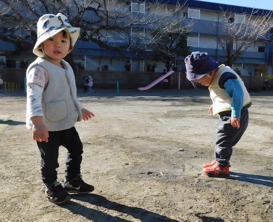 「おしっこと出会っている」子ども(右)と、「お友達がチッチでたよ」と保育者に教える子ども。