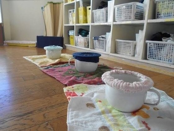 そうはいっても集団保育の中でのおもらし対応。保育室の環境設定や園庭遊びの時のおもらし対応の工夫はとても重要なことでした。保育室ではすぐとれる場所におしっこを拭くもの。それを入れるもの。園庭でのおもらしにすぐ着替えられる着替えセット、濡れた服を入れるバケツ…などなど少しでも大変にならないように、ポジティブに向き合うために工夫をしました。