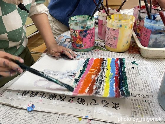 細かく切った紙を細かく色付けていく人もいれば、全体を虹色に染めていく人も。