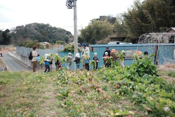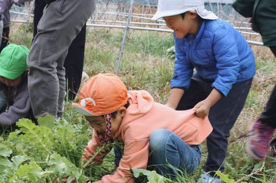 SHO Farmは、「千年続く農業」を掲げ、環境再生型農業といわれる不耕起栽培に挑戦する、横須賀にある農園です。そこに立つだけで、土の中や草花のあいだに、生き物たちの気配を感じるような場所。年長組の子どもたちがここで種まきから三浦大根を育てさせてもらって、今年で3年目になります。