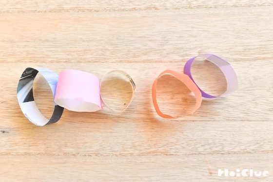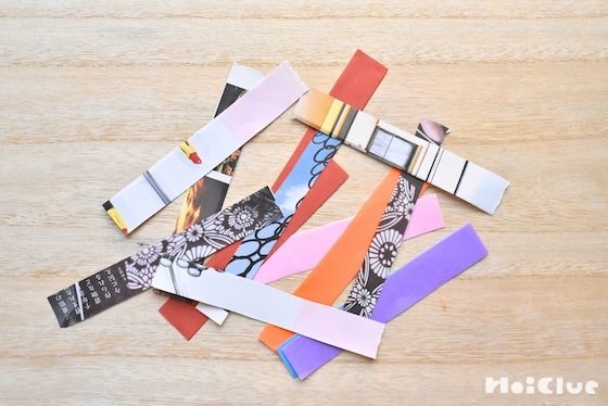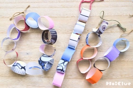 - 1歳くらいの子どもたちは、大人が作ったものをくっつけるのを楽しめそうです。2歳くらいの子どもたちは、好きな色や模様の紙を選んだり、短くつなげたり、大きな子どもたちは長くつなげたり、友達とつなげ合ったりしても楽しそうです。