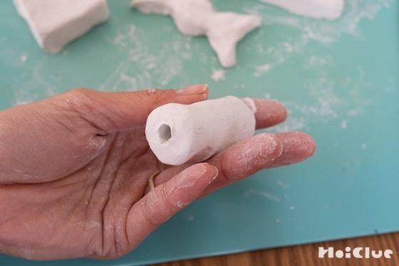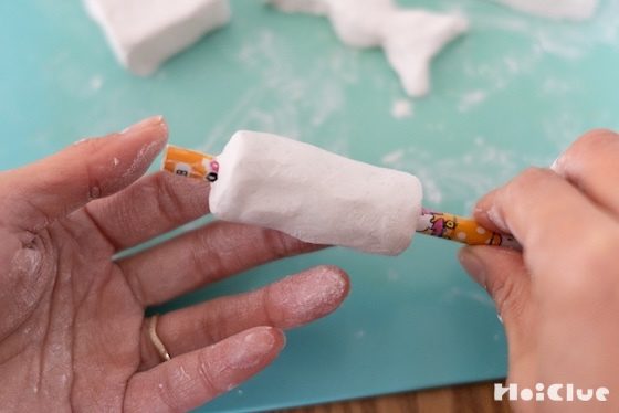4. ちくわを作ります。丸いえんぴつに紙粘土を巻きつけて、ちくわの形にします。
