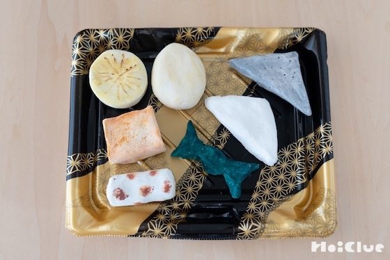 1. 紙粘土が乾いたら色塗りをします。大根・たまご・こんにゃく・はんぺん・厚揚げ・ちくわ・結び昆布に色を塗りました。