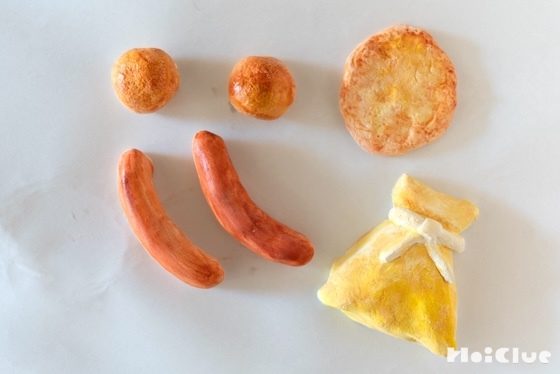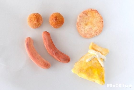 1. 最初に紙粘土で、おでん種の形を作ります。