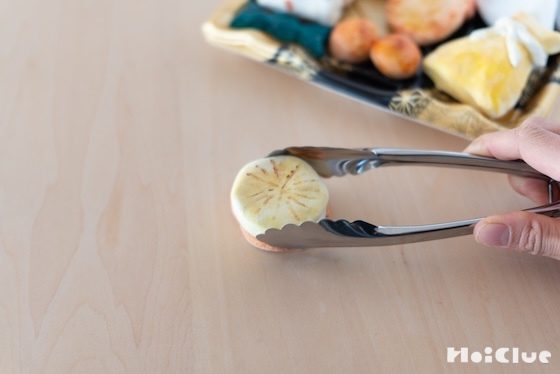 いよいよ「おでんつみゲーム」スタートです!トングで好きな具を取って、崩れるまでに何個積めるか挑戦します。最初に置くのは、もち巾着にしようかな…