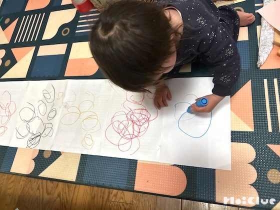 今回は、乳児さんの「なぐりがき」とそれを捉える大人の視点に焦点をあてて遊びの様子を紹介しました。この頃のお絵描きというと、子どものなぐりがきをお花やお家に見立てたり、こいのぼりなど季節や行事に合わせて描いて展示したり…と考える方もいらっしゃるかもしれません。