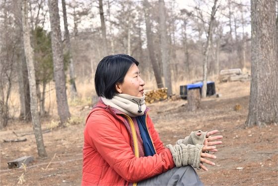 園長の遠藤綾さん。インタビューも風越幼稚園の森の中で。