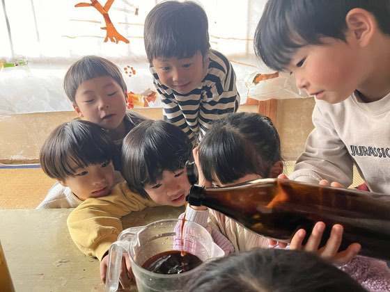 「何入れるか覚えてる?」というマスターの声に、「みりん! おさけ! しょうゆ! こんぶ!」と迷いなく答えます。