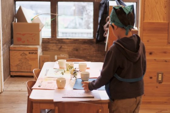 ランチョンマットをつくり、テーブルに庭の花を飾り、「いらっしゃいませ」と声をそろえて練習する子どもたち。