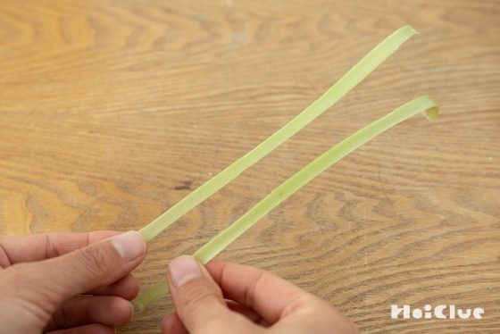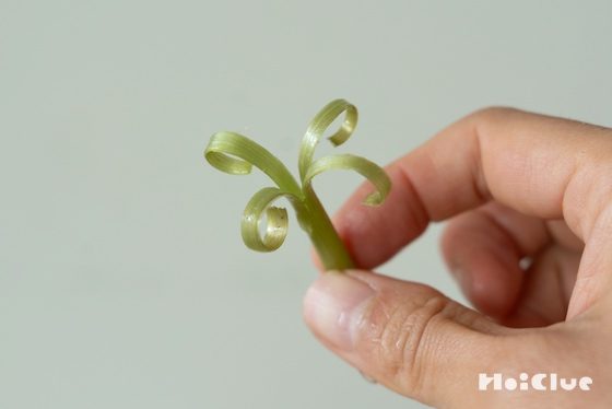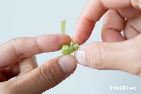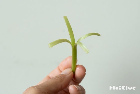 茎の両側を割いてクルクルさせたら、 小さな風車を作ることもできます。 遊び方はこちらの記事をどうぞ。