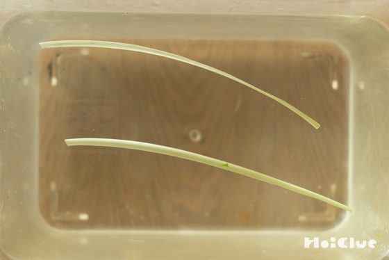 7. 水に入れると、だんだんと茎が端から曲がってきます。
