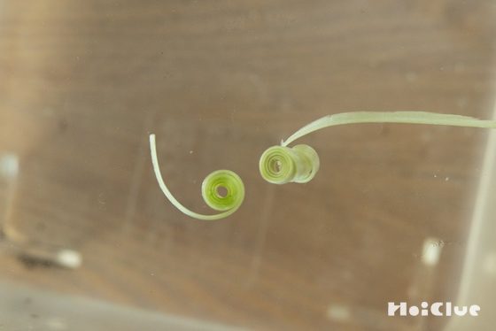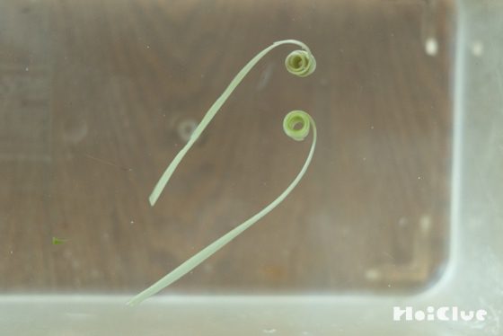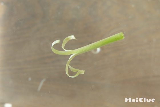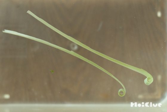 9. 一時間経ち、茎の大部分がクルクルとしたら、水から出します。